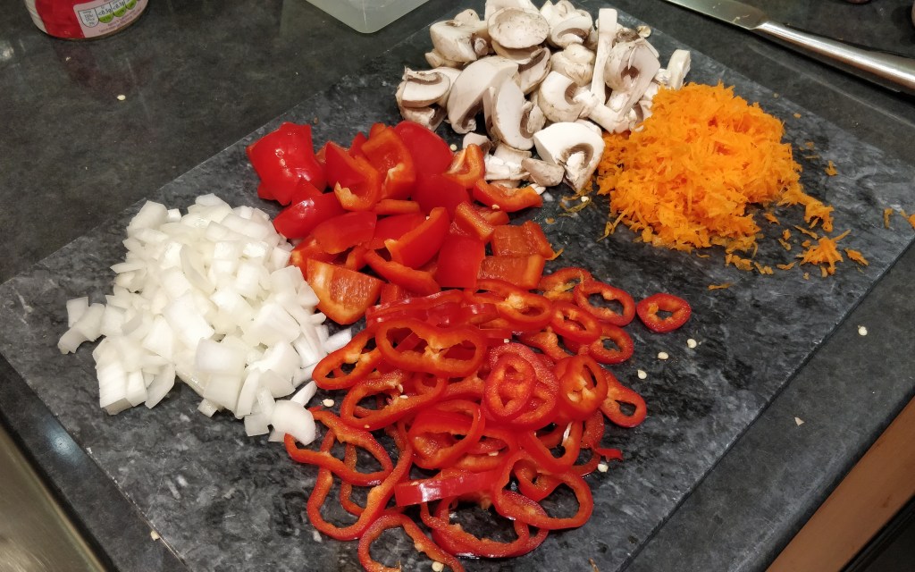 1) Prepare you veg – you can chop you veg however you like but I like to chop mine into different sizes to give a variety of textures to the dish.