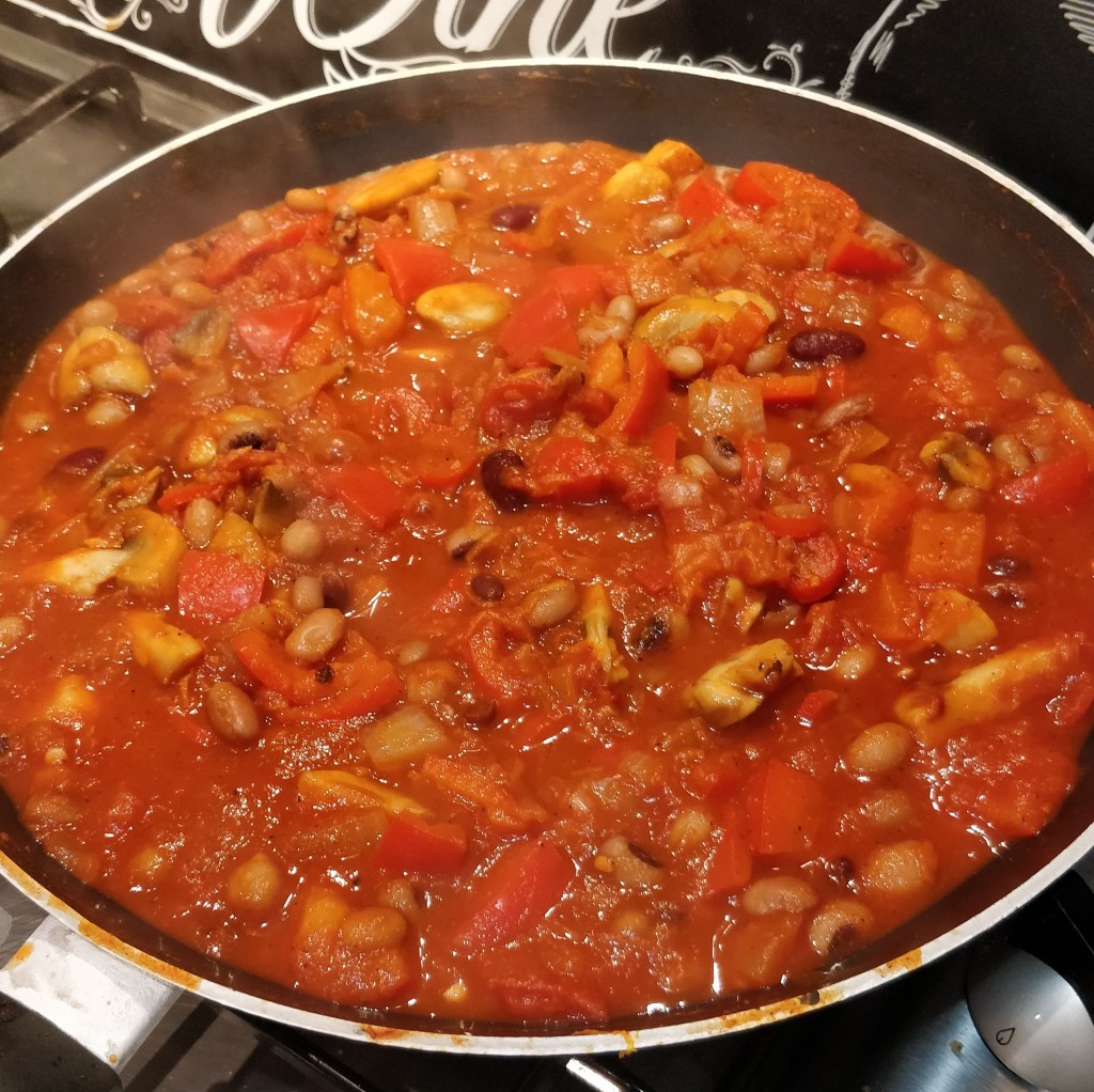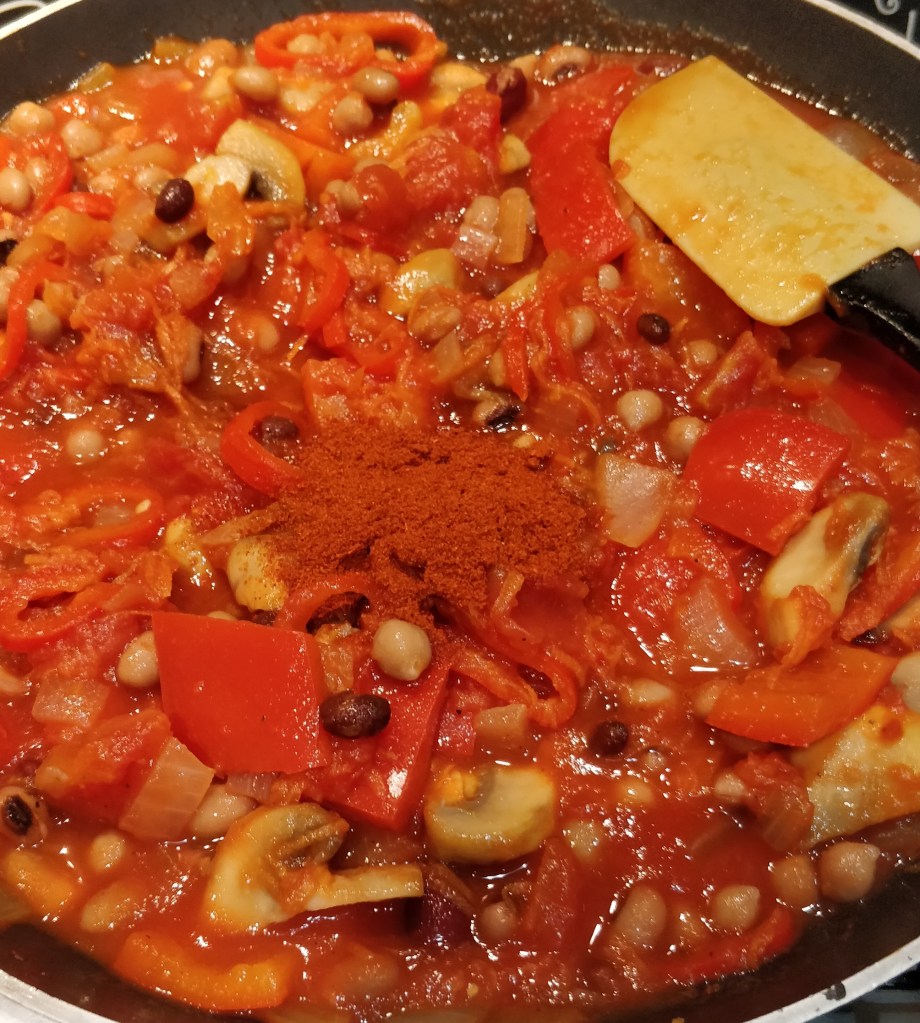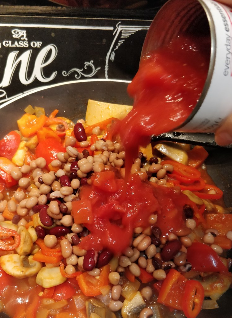 If you want to convert this in to a slow cooker meal, follow steps 1-4 then add everything else to the slow cooker. Leave it on low for 4-8 hours for a tasty slow cooked meal. To turn this into a meat based dish, fry some diced casserole beef along with the onions (step 2). Leave the beans and mushrooms out and use only one pointed pepper. Your cooking time will need to be adjusted to the guidelines on the packaging of the meat you select.