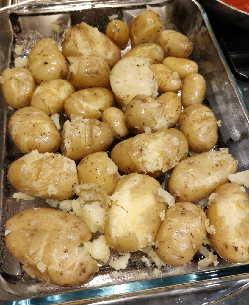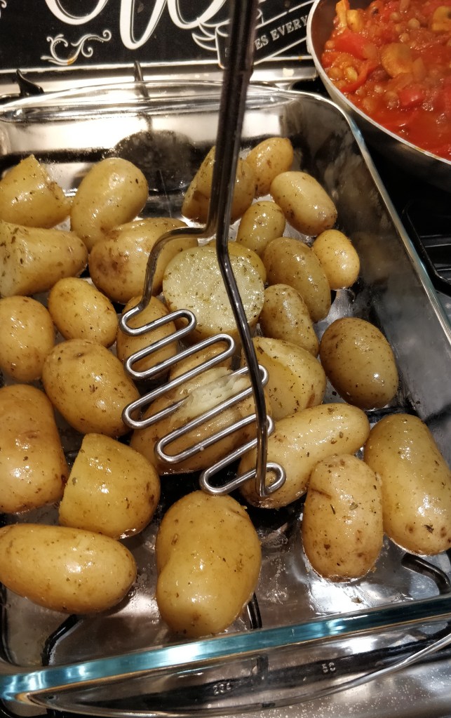 4) Transfer to an over dish or roasting tray then crush each potato by gently pressing down on it. You can use a potato masher, spatula or a fork.