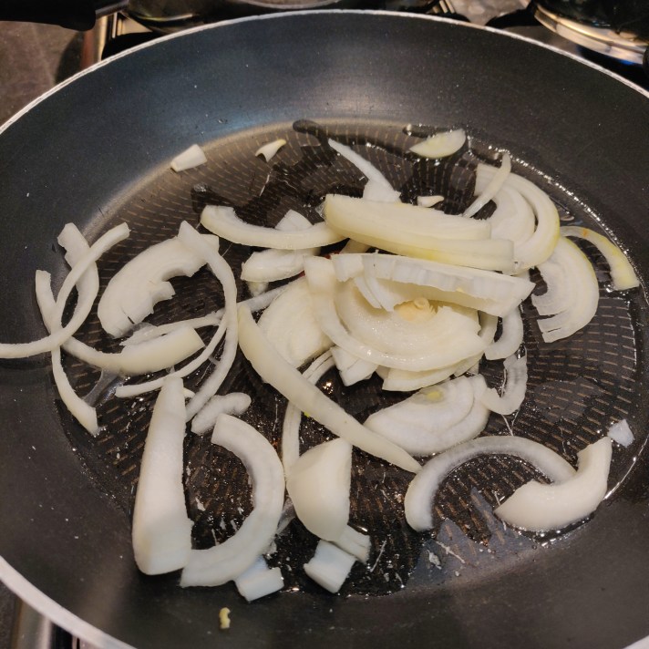 - Slice the onions and add to the pan of sausages. Sprinkle with a pinch of salt. Fry for a further 5 minutes until the sausages are browned and onions are soft.