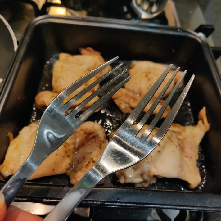 - When the chicken thighs are cooked, remove from the oven then gently pull apart the meat using two forks. Add the shredded chicken and any juice to a frying pan.