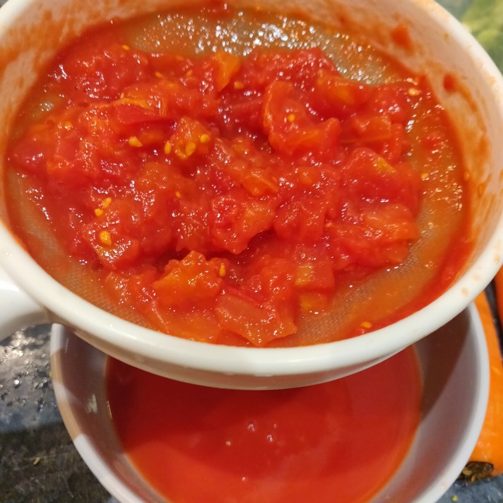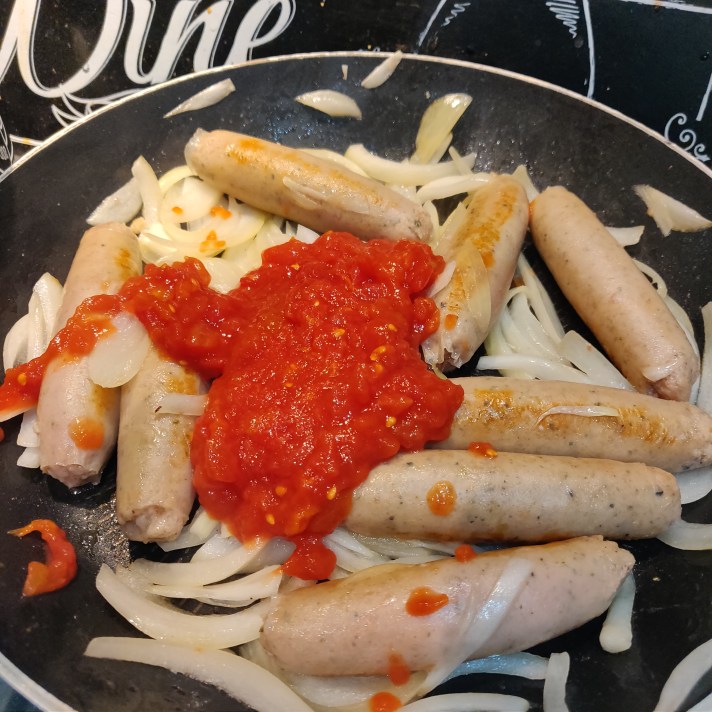 - Whilst the potatoes are simmering, sieve the tin of tomatoes (retain the juice for another recipe) Add the strained tomatoes to the pan of sausages along with the paprika and a pinch of pepper and sugar – you don’t need salt because of the stock cube. Stir and simmer for 5 minutes.