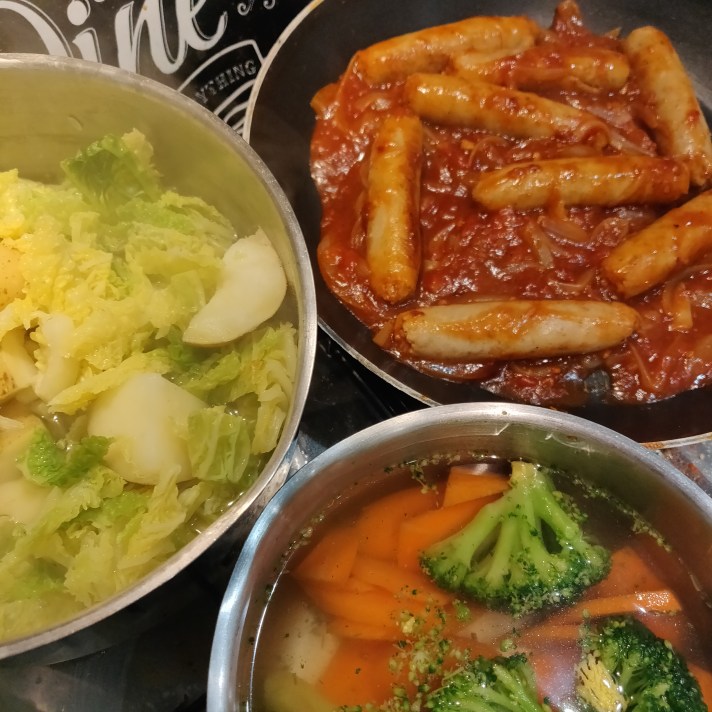 - Around 5 minutes before the potatoes are cooked, add the chopped cabbage to the pan of potatoes. Pour boiling water into the pan of carrots and broccoli and place on the hob on a medium heat. Stir and simmer for five minutes.