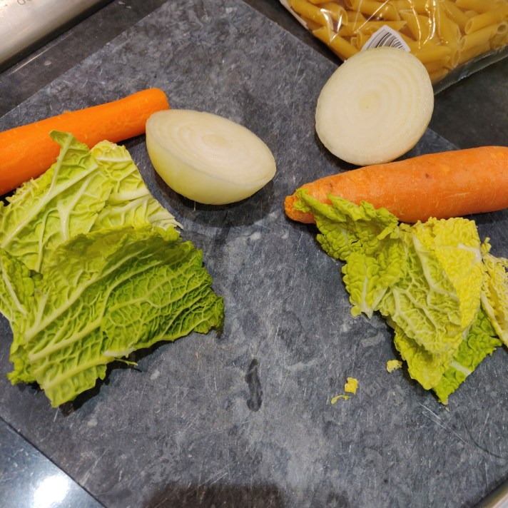 - Roughly chop the cabbage and put aside for later. Peel and chop the carrots then place in a pan with the frozen broccoli. Put the pan to one side until later.