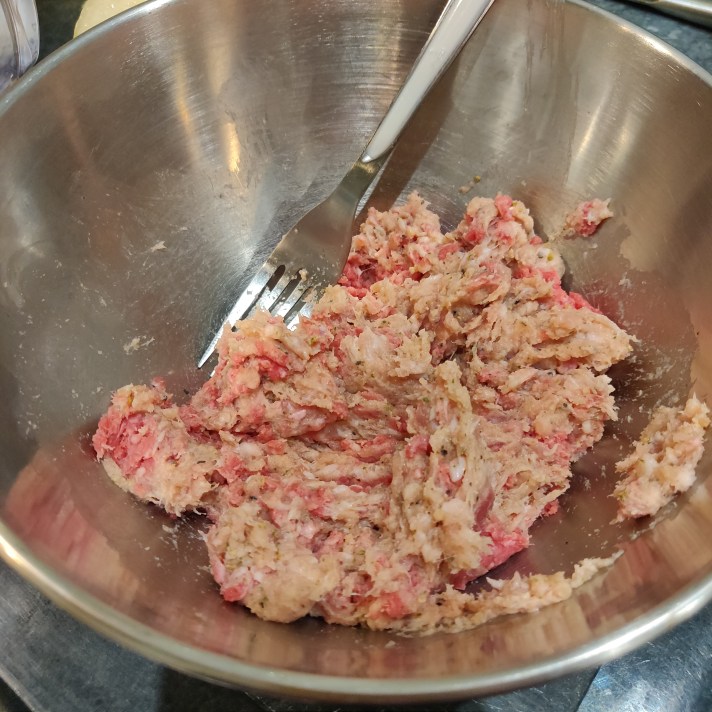 - Remove the skin from the raw sausages and add the meat to a bowl. Add in the raw mince.