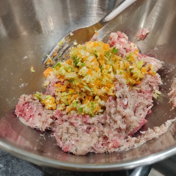 - Add a third of the blended veg mix to the sausage and mince meat and then continue to mix and mash using a fork. Do this until the mix is fully combined.