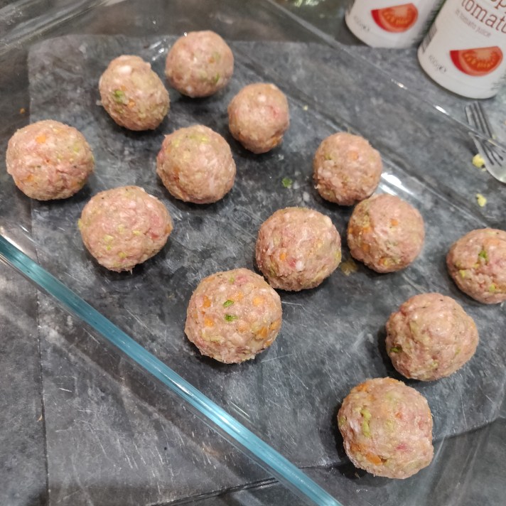 - Now it’s time to make your meatballs, wet your hands slightly and the pull out 30g portions of the meat and veg mix. Roll in the palms of your hand to form into a ball shape then place in an oven proof dish or tray. (You can make mini meatballs too using 15g per meatball).