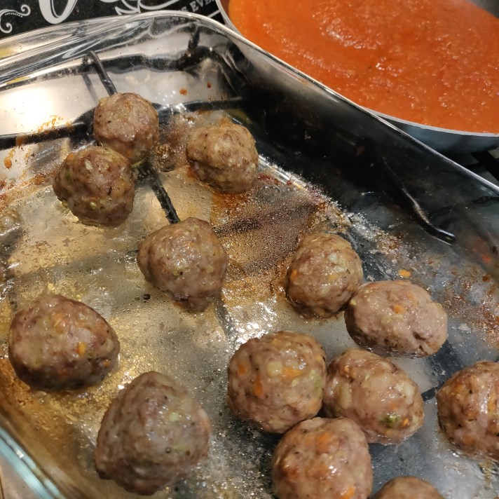 - Remove the meatballs from the oven and add to the sauce, simmer until ready to serve.