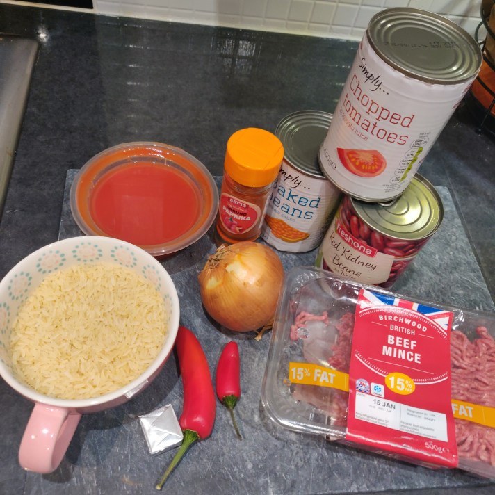 Thrifty Tip – For bigger appetites, you could serve this with jacket potatoes or potato wedges as well as rice. Or for a healthier side dish you could serve it with broccoli or a simple salad of lettuce with grated carrot. For a veggie alternative, swap the beef stock for veg stock and in place of the mince beef, you could use lentils, chickpeas or any other kinds of beans.