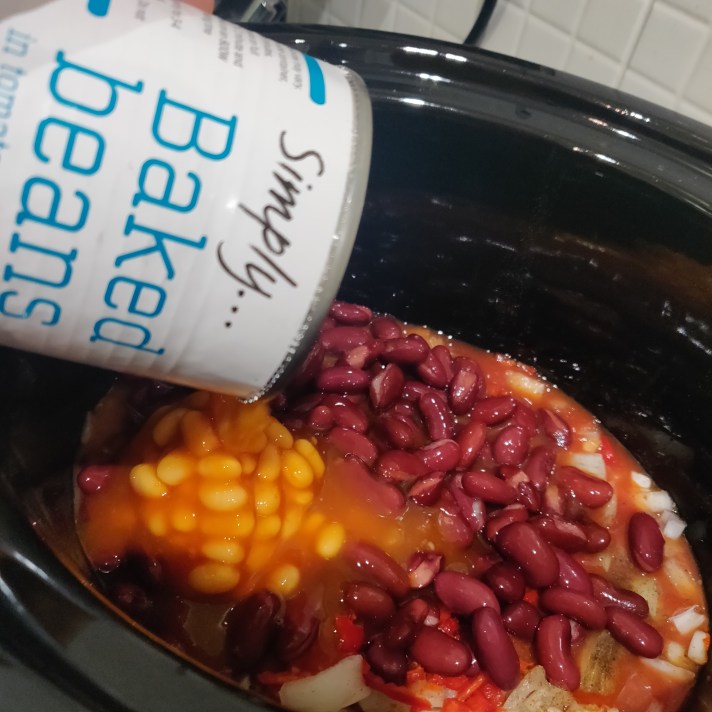 - Add in the tin of chopped tomatoes, the tomato juice, kidney beans, baked beans and stock cube to the mince. Sprinkle in around one tablespoon of sugar. Stir to combine.