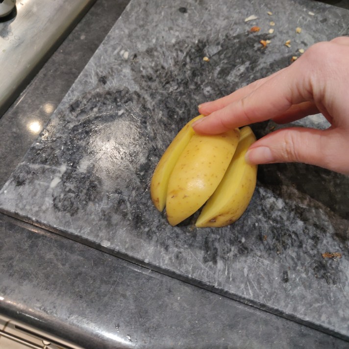 - Once the chicken is in the oven, start making your wedges. Chop your potatoes in half (top to bottom) then slice each half into three wedges.
