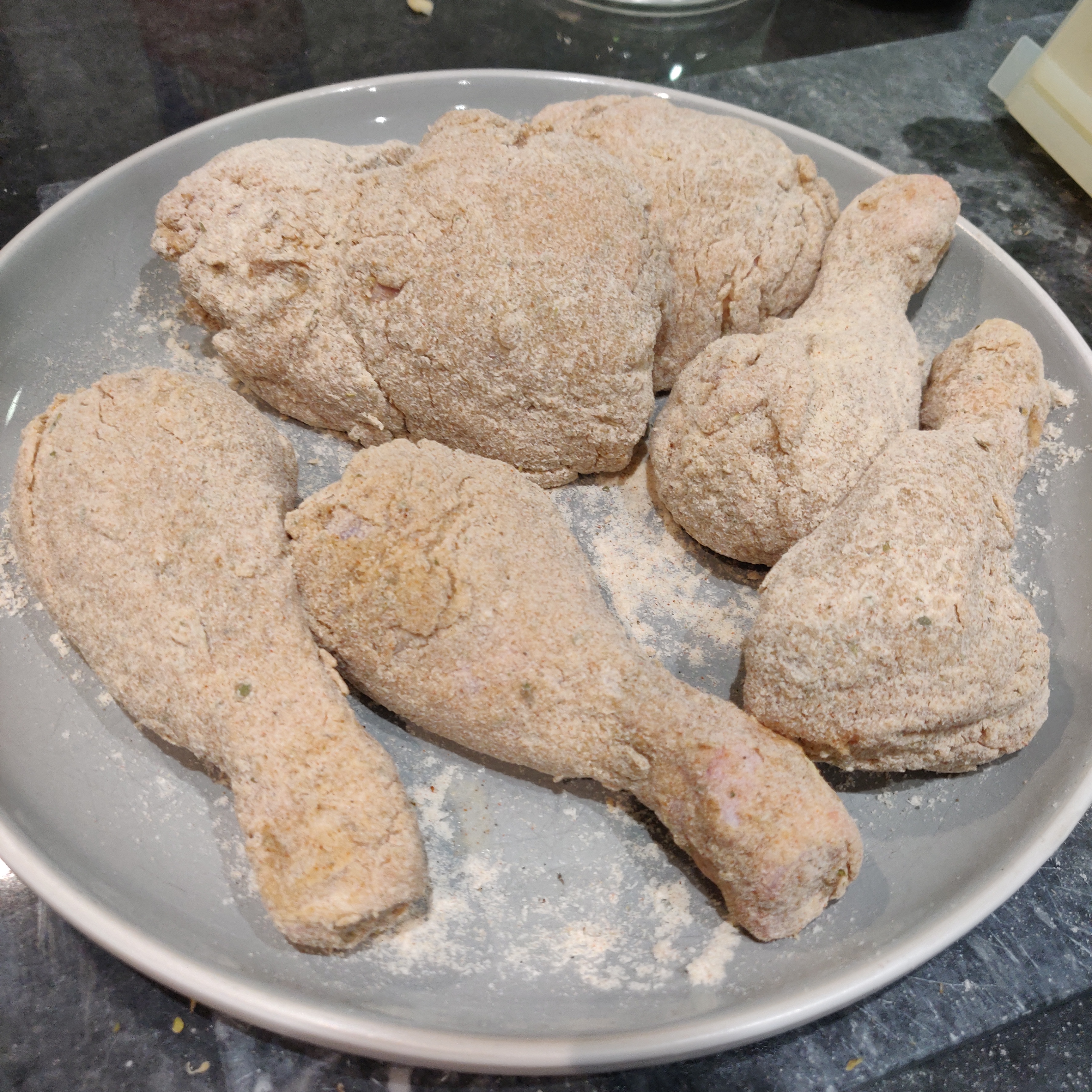 The coating mix ingredients are enough for coat around 6 thighs and 6 drumsticks. I had plenty leftover which is why I double dipped and even then I still had some left from costing 7 pieces of chicken.