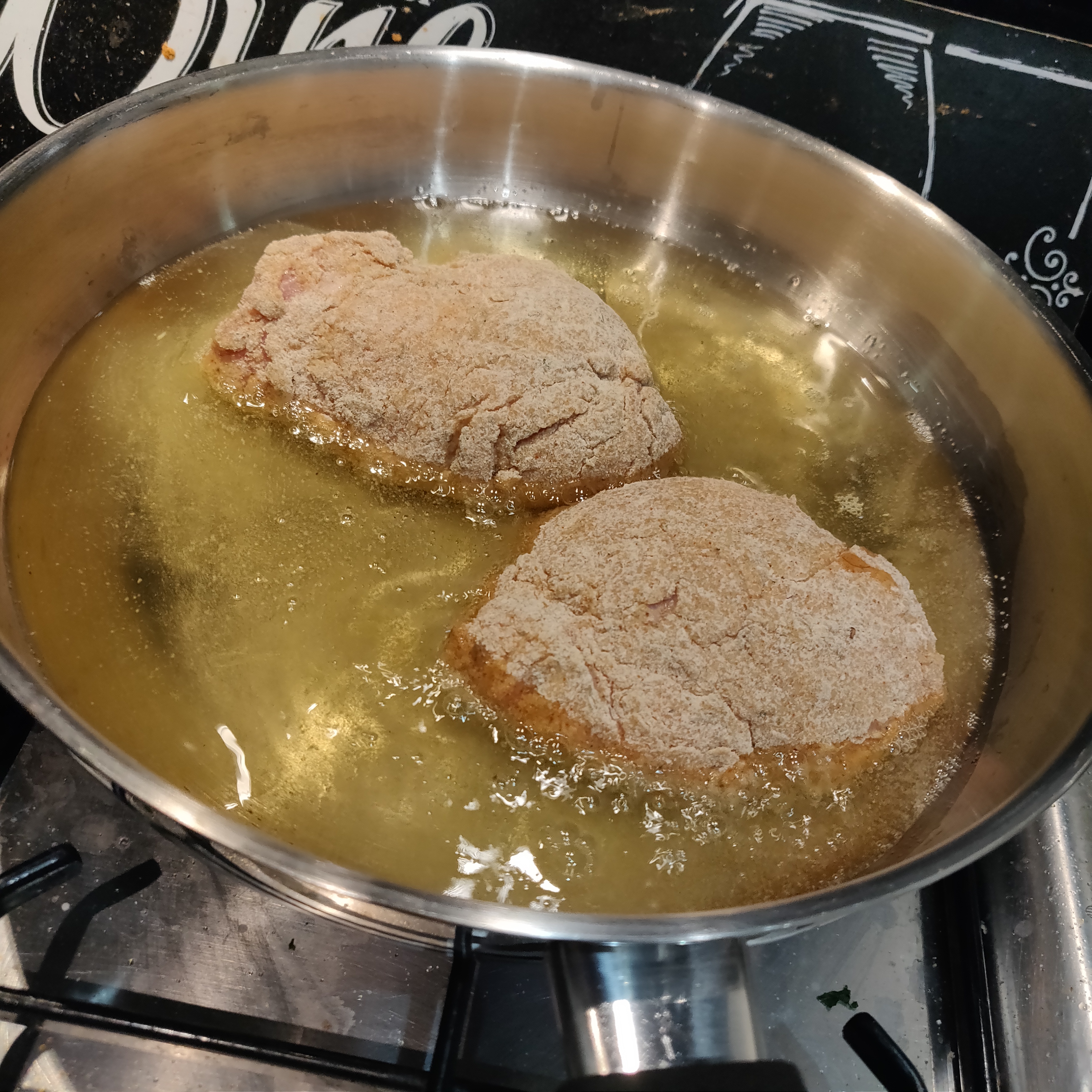 - Dip the chicken pieces into the milk/egg mix. Let the excess drip off the place the chicken into the dry mix.