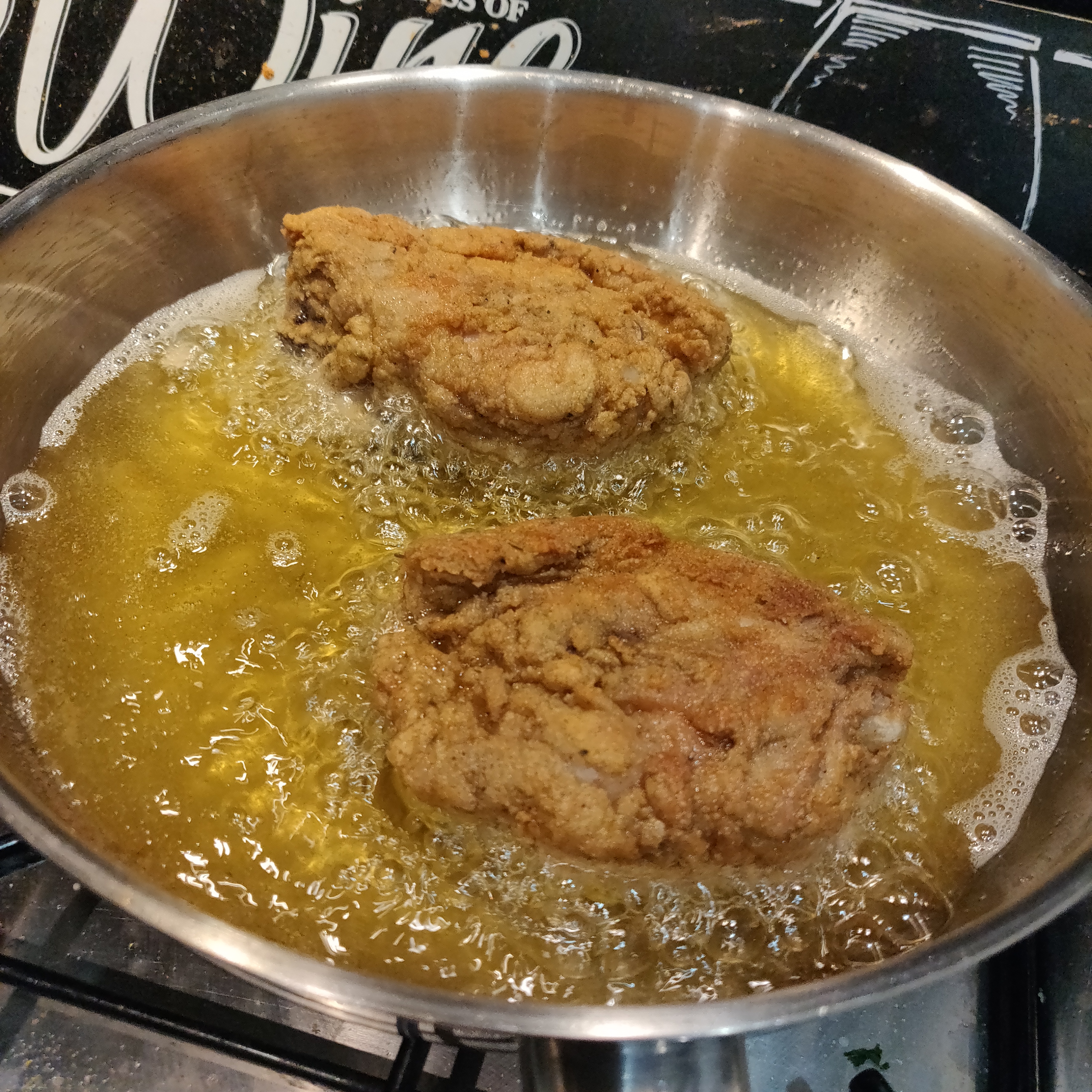 - Fry the chicken for 3 minutes on each side then place on an oven tray. Continue cooking the chicken in batches until all pieces are fried.